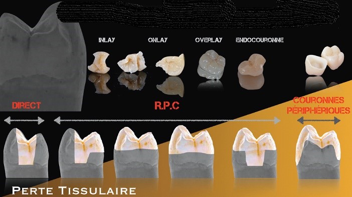 En dehors de la classique couronne périphérique l’avancée des technologies et des matériaux permet aujourd’hui des reconstructions plus préservatrices de la structure dentaire .